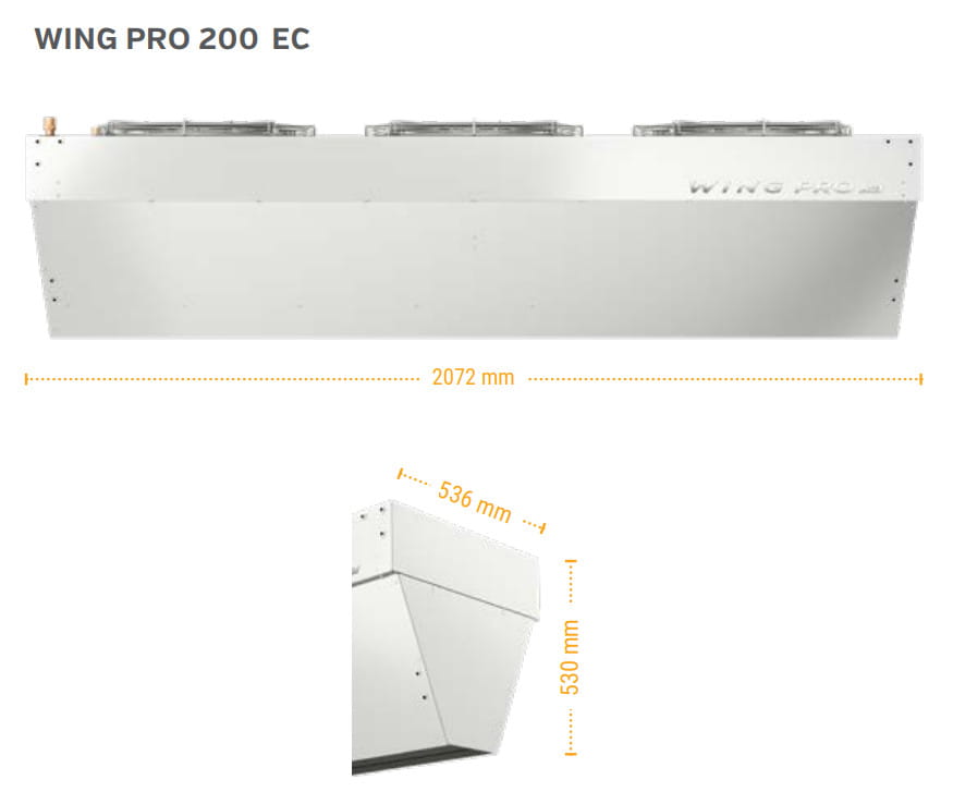 WING PRO W200 R2 EC: kurtyna powietrzna o długości 2072mm, wyposażona w dwurzędową nagrzewnicę wodną o zakresie mocy grzewczej 28-88kW