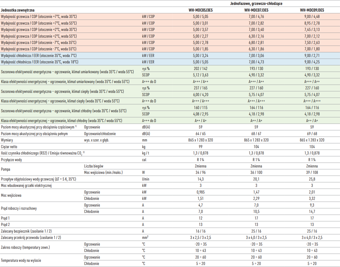 - Wysoka wydajność grzewcza i chłodnicza, zakres temperatur zasilania w trybie chłodzenia